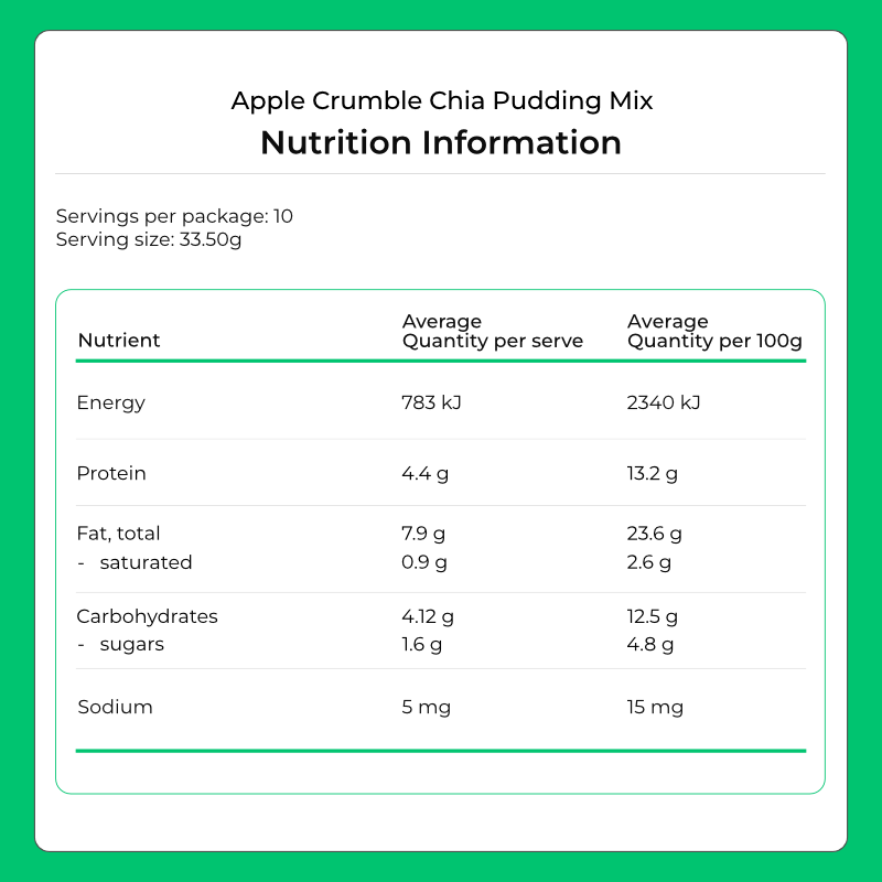 I found this flavour way too strong. I didn't want the rest of the packet to go to waste so I bought some organic plain black chia seeds and tried half and half - 1 1/2 tablespoons of Apple Crumble mix, and 1 1/2 tablespoons of plain chia seeds.